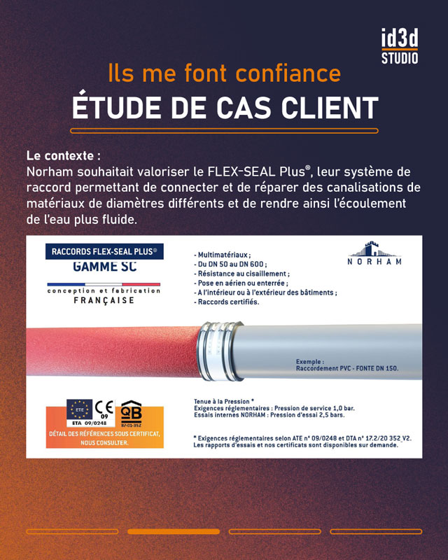 NORHAM fabrique des raccords de tuyauterie. Leur produit phare, le FLEX-SEAL Plus®, a une promesse claire : assurer une continuité parfaite entre deux tuyaux, pour un écoulement sans turbulence ni obstacle.